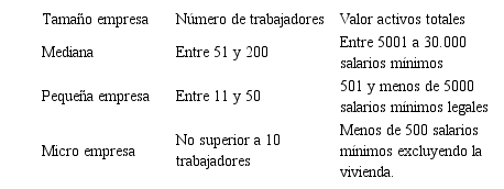 La clasificación de pequeñas y medianas empresas a nivel mundial no se encuentra unificada, ya que su clasificación obedece a diferentes criterios como empleo, ventas, número de empleados, activos totales, entre otros (Zevallos, 2003). En Colombia, de acuerdo con el Ministerio de Industria y Comercio y Mipymes, la clasificación de las empresas está reglamentada por la Ley 590 del 2000 y sus modificaciones (Ley 905 del 2004), conocida como la Ley MiPymes, la cual las clasifica con base al número de trabajadores y al valor de los activos, tal como se muestra en la Tabla I: