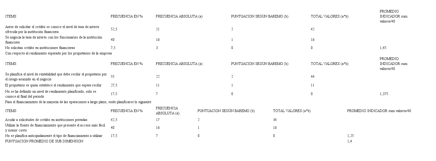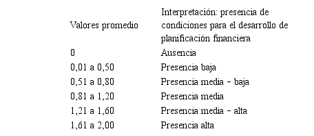 Así mismo, se escoge el diseño de campo no experimental aplicando como técnica de recolección de información la encuesta de gestión financiera en pequeñas y medianas empresas desarrollado por Vera (2008), con el fin de estandarizar la información. La encuesta esta compuesta por 62 preguntas cerradas y alternativas de respuesta que corresponden a la siguiente escala: Alta presencia 2 puntos, Presencia media 1 punto, Baja presencia 0 puntos. Para indagar en los parámetros financieros para toma de decisiones de corto y largo plazo en las pymes de Duitama, se tomaron 22 preguntas. El análisis de la información se realiza utilizando la hoja de cálculo de Microsoft Excel, efectuando cálculos de frecuencias, promedios ponderados de cada indicador, promedios aritméticos de la dimensión, que se interpretan con base en la Tabla II donde se determina el nivel de presencia de parámetros financieros para toma de decisiones de largo plazo y corto plazo en las pymes del sector manufacturero de Duitama.