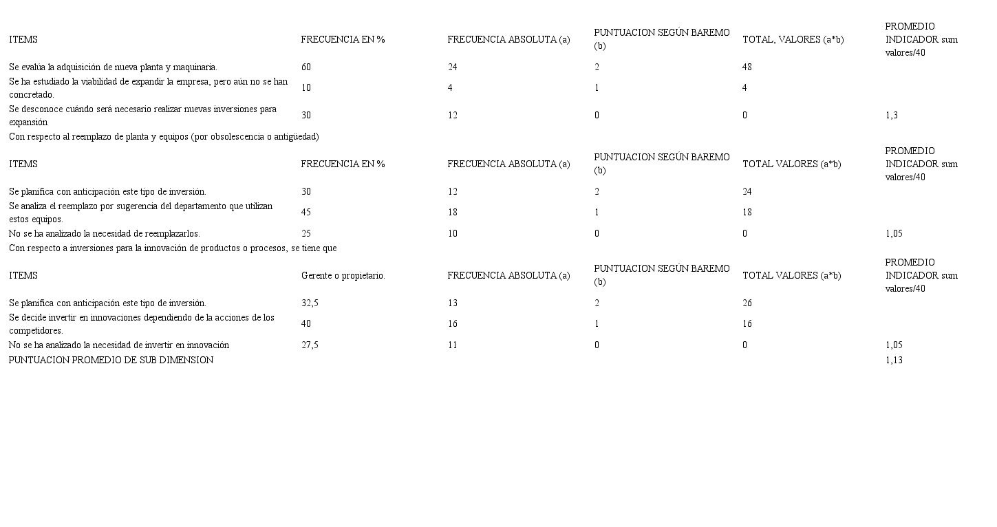 En relación con las inversiones para la innovación de productos o procesos, el 40% de las pymes estudiadas, toman la decisión de acuerdo con como observan que se va dando en las empresas competidoras, decisión que se da a cargo del gerente o propietario y planifican con anticipación; sin embargo, un 27,5% no ha visto la necesidad de hacer este tipo de inversión (ver Tabla III).