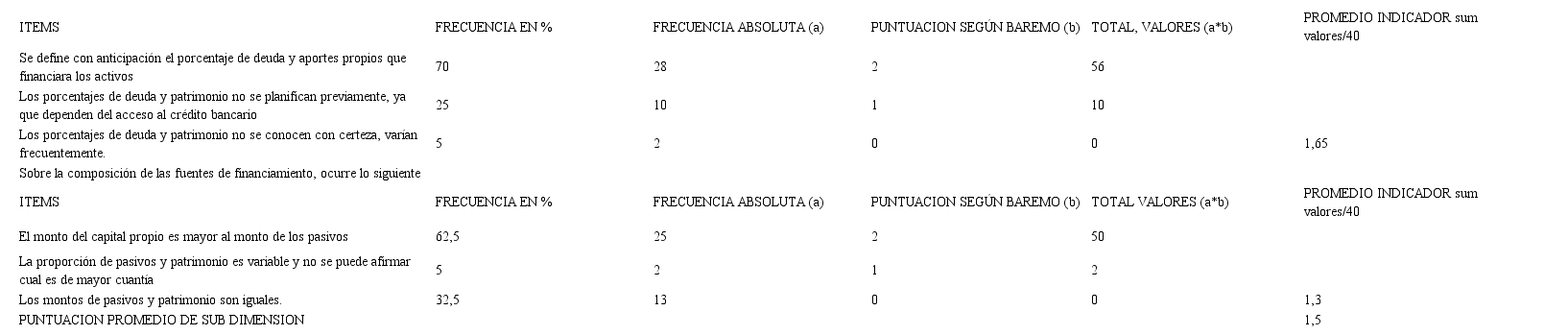 En lo que respecta a Métodos para la evaluación de inversiones; la puntuación promedio de la composición de la estructura financiera presentó 1,5 con presencia media alta, donde el 70% define con anticipación los aportes propios con los que pueden financiar activos, mientras que el 30% no pueden hacer una planificación previa ya que están sujetos al acceso de créditos bancarios. En lo relacionado con las fuentes de financiamiento los encuestados en un 62,5% respondieron que generalmente el capital propio es mayor a los pasivos ya que los empresarios no quieren arriesgar el patrimonio que han trabajado (ver Tabla IV).