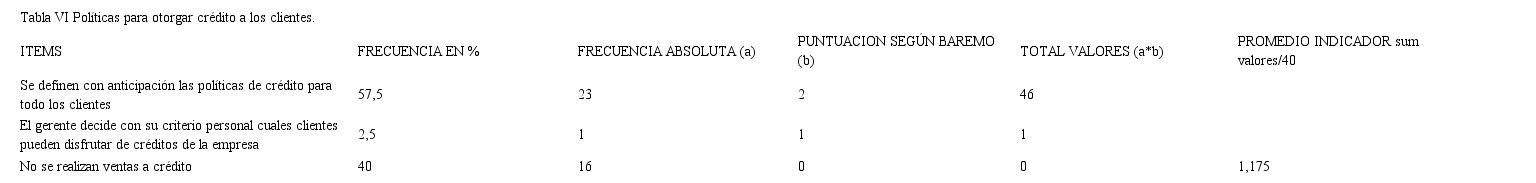 Respecto a los Créditos y cobranzas a clientes (Tabla VI) en el estudio de las Pymes de Duitama, el 57,5% define con anticipación las políticas para ofrecer créditos a los clientes, el 40% no realizan ventas a crédito o en caso de hacerlo se hace una excepción a los clientes con los que ya hayan tenido experiencia, finalmente un 2,5% otorgan el crédito según el criterio personal del gerente.