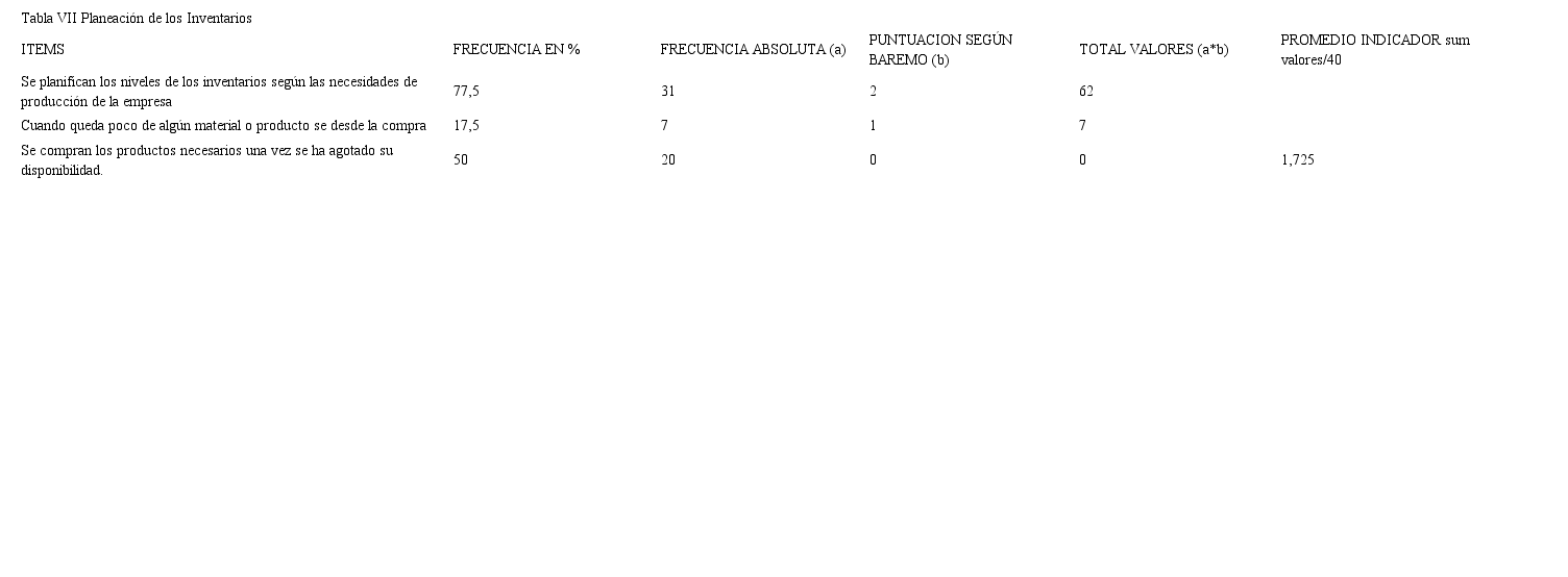 En cuanto al Manejo de inventarios, se puede observar en la Tabla VII que en el 77,5% del sector manufacturero de la ciudad de Duitama, en pequeñas y medianas empresas se planifica según las necesidades de producción a medida que el personal encargado de esta área hace la solicitud para la compra de materia prima, el 17,5% decide la compra cuando ven que los stocks de bodega presentan pocas unidades y el restante 50% compra la materia prima y los elementos necesarios para la producción solo cuando se han agotado todas las unidades.