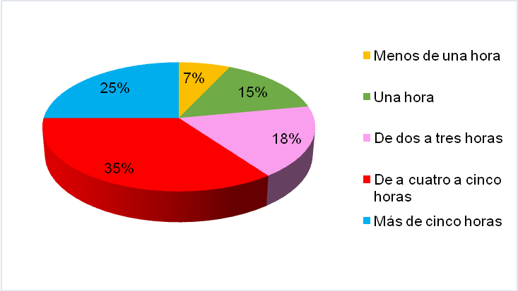 En la siguiente pregunta se pretende conocer el tiempo que se estima a estar frente a la computadora diariamente. Las respuestas como se muestran en el Gráfico I, van desde, menos de una hora, hasta más de cinco horas. De acuerdo con los datos obtenidos por el Estudio Internacional Fundación BBVA (2011:1), en el año 2010 se encuestaron a más de 18.000 universitarios en seis países europeos, “casi la totalidad de ellos accede diariamente, y una amplia mayoría la utiliza como un espacio de información y de comunicación…”. Aunque este estudio no es reciente, las estadísticas varían poco, lo cual llama fuertemente la atención si se comparan con los resultados obtenidos de este trabajo.