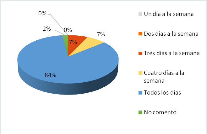 Cuando se les cuestionó con qué frecuencia hacían uso del internet, el 84% de los participantes, respondió diariamente. Se dan por desiertas las respuestas “Un día a la semana” y “Dos días a la semana”, ya que ninguno de los participantes señaló conectarse con esa frecuencia. Se observa que el 14% de los participantes lo usan tres o cuatro días (ver Gráfico III).