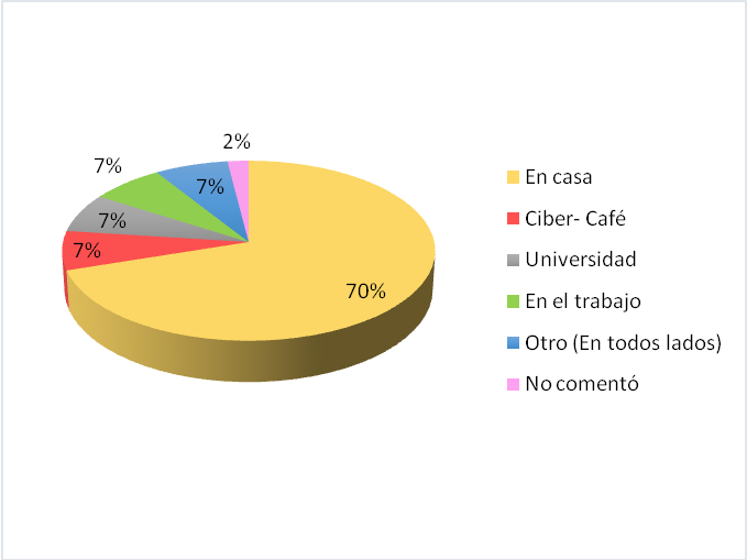 Asimismo, se presenta que los estudiantes prefieren usar internet en casa, así lo manifiesta el 70% de los participantes en el Gráfico V, comparados estos resultados con los mostrados en el Gráfico II, que 53% manifiesta contar con internet en casa, hay un 17% (34 estudiantes) que no ha contratado un plan para su equipo, aunque, manifestaron estar en pláticas para hacerlo, esto se comentó de manera informal. En el Gráfico V, también se observa que un 28% prefiere un sitio público (Universidad, Ciber café, en el trabajo) para acceder a internet. Esto debido a que se sienten menos vigilados por sus padres. El estar lejos de ellos, les da libertad de decisión sobre qué páginas visitar y el tiempo dedicado a cada una de ellas.
