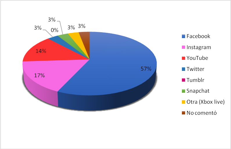 Al cuestionamiento sobre la red social de su predilección, en el Gráfico VII se puede visualizar que los participantes respondieron de la siguiente manera: 57% se inclinan por Facebook, 17% por Instagram, 14% por YouTube y con menor porcentaje Twitter, Snapchat y live. De acuerdo con las estadísticas de redes sociales en el mundo en el sitio de Fhios (https://www.fhios.es/), hay 2.789 millones de usuarios activos, un 37% de la población mundial. Según las estadísticas de We Are Social y Hootsuite (https://wearesocial.com) en Facebook hay 1.871 millones de usuarios activos al mes, seguido de YouTube con 1.000 millones e Instagram con 500 millones.