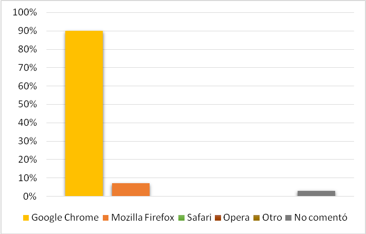 En cuanto a los navegadores que ellos prefieren, el 90% se decanta por Google Chrome, de acuerdo con Stat Counter Global Stats, las estadísticas realizadas en marzo de 2018, los navegadores más utilizados a nivel mundial son: Google Chrome con un 57,41%, Safari con un 14,4%, UC Browser con un 7,94%, Firefox con un 5,49%, Opera con un 3,7% e, IE con un 3,05%. En el Gráfico VIII se observa que el 7%, (14 estudiantes) prefieren Mozilla Firefox.
