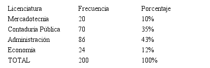 La Tabla II muestra la participación de las licenciaturas en la asignatura, en atención a los estudiantes matriculados, pudiéndose destacar que el 78% pertenece a las licenciaturas en Administración y Contabilidad, y el resto a Economía y Mercadotecnia.