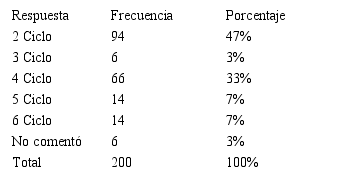 En esta institución cuyo modelo académico está basado en la flexibilidad curricular, los estudiantes tienen la opción de hacer sus propios horarios y cursar las materias como ellos consideren pertinente, en la Tabla III, se observa que pertenecen a varios ciclos, el 47% pertenece al segundo ciclo, en tanto que el 3% (6 participantes) no respondió a esta pregunta y otro 3% (6 estudiantes) pertenece al tercer ciclo. Estos datos están relacionados con los mostrados en la Tabla I, en la que se muestra la edad de los participantes en este estudio. Para cursar esta materia hay libre oferta, el único tope es que antes de obtener su carta de pasante, deben haberla cursado.