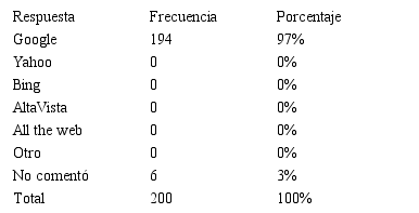 En la tabla VIII se presentan los resultados a las respuestas que los alumnos dieron a la pregunta sobre cuál era el buscador utilizado por ellos, el 97% señaló Google, lo prefieren por su fácil acceso, es ideal para socializar, incluyendo también el uso de redes sociales (Herrera-Batista, 2009), el 3% no respondió a esta cuestión.