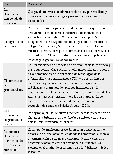 Así, se observa que el proceso de innovación en turismo muestra cierto grado de interdependencia, ya sea entre competidores y clientes o incluso entre destinos turísticos. Por su parte, Maráková y Medveďová (2016) indican que entre las causas que impulsan la innovación en las empresas turísticas, se encuentran las expresadas en el Cuadro I.