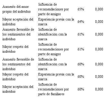 Con respecto a la autoestima, se evidenció una correlación entre una mayor aceptación del individuo y el haber tenido una experiencia previa con la marca, así como una respuesta de identificación con la imagen de la marca. Estos mecanismos de relacionamiento pueden estar ayudando al mejoramiento de la autoestima de los consumidores, fortaleciendo su autoconcepto. Estos hallazgos concuerdan con lo planteado por Arndt et al., (2004) y Yu y Liu (2015).