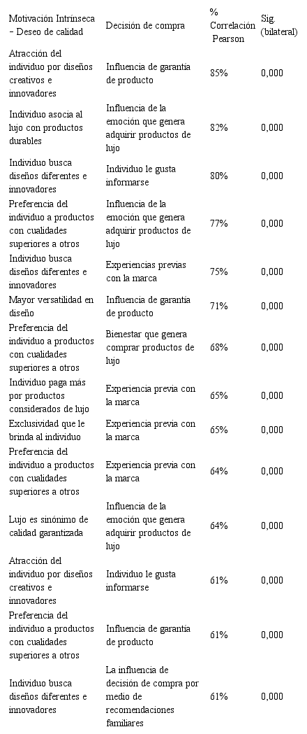 A continuación, se presentan las correlaciones de Pearson significativas y superiores a 0,6 de cada tipo de motivación intrínseca con la decisión de compra de productos de lujo de vestuario y accesorios.