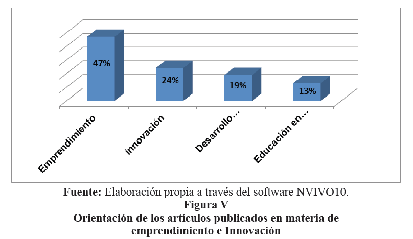 De los 633 artículos que fueron sometidos a estudio, la Figura V muestra que el 47% de los artículos, tienen una inclinación por el Emprendimiento, el 24%, con la Innovación, el 19% con el Desarrollo Sostenible y finalmente, el 13%, conformado con una tendencia a la Educación en Emprendimiento.