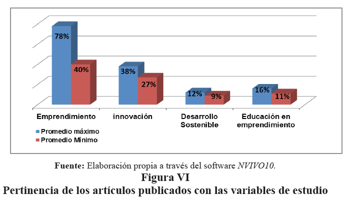 Por otra parte, se analizó la pertinencia y la relación de las variables (Emprendimiento, educación para el emprendimiento, innovación y desarrollo sostenible) con respecto a los artículos, observándose que estos están asociados en su mayoría con el emprendimiento y sin duda, involucrando su contenido a esta variable el cuál representan un promedio máximo de acercamiento de un 78% y un mínimo de 40% (ver Figura VI).