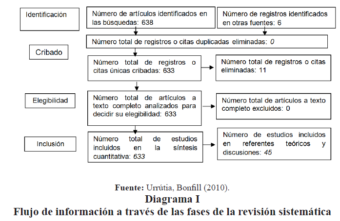 A partir de una identificación de 638 artículos publicados en los índices bibliográficos que cumplieran con los criterios de elegibilidad se filtraron 633 artículos que cumplieran con los criterios de elegibilidad descritos anteriormente y que fueron finalmente incluidos en el análisis de la producción científica, de los cuales 45 artículos fueron incluidos en la construcción de los referentes teóricos y las discusiones de este estudio (ver Diagrama I).