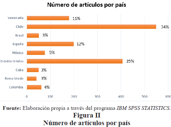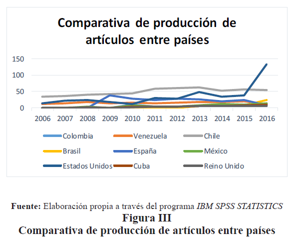 En la siguiente Figura II, se observa el país de procedencia de los artículos, destacando en primer lugar con mayor cantidad de artículos a Chile con el 34%, que ha liderado este campo desde el año que ha sido tomado como punto inicial de referencia de este estudio hasta el año 2016, seguido por Estados Unidos con el 25%, luego España con el 12%, seguido de cerca por Venezuela con el 11%, observándose una menor representación por México con un 5%, Colombia con 4% y, por último, pero no menos importante Reino Unido, Cuba y Brasil con un 3% (ver Figura II). Este análisis demuestra que el emprendimiento y la innovación son factor clave para el desarrollo económico de los países, razón por la cual se reflejan altos porcentajes en el manejo de estos temas que permiten impulsar de una manera u otra la creación de nuevas empresas, la formación de emprendedores.