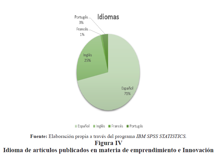 Por otra parte, el 71% de los artículos se encuentran en español y el 25% en inglés, seguido del 3% en portugués y finalmente el 1% en francés, resaltando que una mayoría de artículos son redactados en español, y encontrándose también artículos de autores latinoamericanos en revistas en inglés, portugués y francés (ver Figura IV).