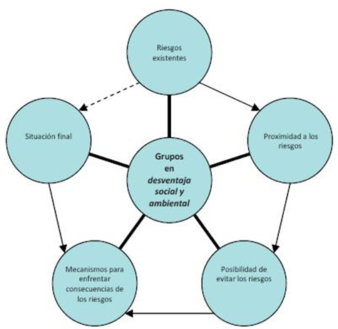 Por el contrario, se debe tener en cuenta que el riesgo social configura tres componentes en la vulnerabilidad social: la peligrosidad o amenaza social, entendida como los aspectos sociales que inciden en el riesgo y que se concreta por la severidad del fenómeno y probabilidad de ocurrencia (Ayala, 2002, citado por Fabre et al., 2012); la exposición de las personas y comunidades localizadas en un ámbito territorial y/o nivel socioeconómico al peligro social; y los activos que forman parte de las estrategias para enfrentar el riesgo (Fabre et al., 2012).