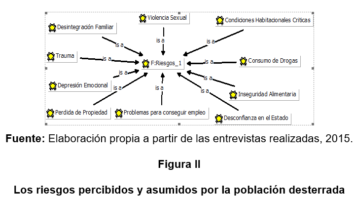 Los riesgos tienen impactos diferentes según se trate de mujeres, hombres, hijos e hijas de las familias. Esto es algo en lo que se debe profundizar. Los datos analizados permiten observar por ejemplo el grado de exposición a la violencia sexual de las mujeres en el marco del conflicto; o el riesgo al consumo de droga al que se exponen los jóvenes cuando llegan a ciudades como Bogotá; estos son apenas algunos temas que deben ser estudiados detalladamente junto a la configuración de los demás riesgos (ver Figura II).