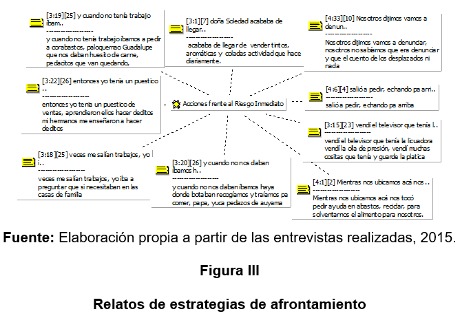 Cada estrategia plantea una serie de particularidades que deben ser comprendidas en el marco contextual en el que se enuncian; por ejemplo, las acciones que se dan en respuesta a necesidades inmediatas como la adquisición de alimentos, contar con un empleo y el propio desplazamiento (ver Figura III) son “estrategias paliativas” para afrontar escenarios muy concretos; diferentes a las asociadas a la organización política que implican una movilización de recursos y alternativas distintas