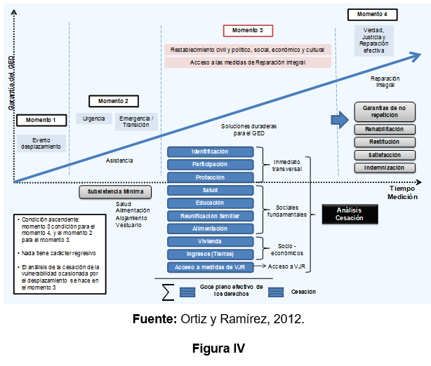 La forma de proceder por parte de las instancias del gobierno no deja de ser reduccionista al definir una linealidad en la atención del desplazamiento en cuatro momentos: desplazamiento forzado; urgencia y emergencia; restablecimiento y acceso a medidas de verdad, justicia y reparación; y obtención de la reparación integral (ver Figura IV).