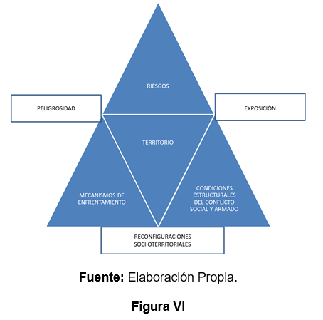 El primer nodo, peligrosidad, resulta de la relación que existe entre el riesgo y los mecanismos de enfrentamiento. Esta relación permite establecer niveles de peligrosidad, de tal manera que cuanto más fuertes sean los mecanismos para mitigar el riesgo o superarlos, menos peligrosidad se puede tener, o viceversa. El segundo nodo, exposición, referencia la relación de proximidad entre las condiciones estructurales del conflicto y las amenazas, de tal forma que se puedan ubicar las maneras como se exponen las comunidades desterradas a los riesgos sociales. El tercer nodo, reconfiguraciones socio-territoriales, se refiere a las relaciones concretas entre las condiciones estructurales del conflicto y los mecanismos de enfrentamiento que utilizan las comunidades desterradas para enfrentar los riesgos, caracterizándolas como estrategias y actividades que propician transformaciones socio-territoriales.