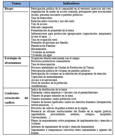 La herramienta de análisis utilizada ha sido la entrevista, cuyo guión está basado en cuatro categorías de análisis: las condiciones estructurales de la población objeto de estudio; el impacto social del desplazamiento; la vulnerabilidad social; y el territorio. Para la vulnerabilidad social se analizan los activos y estrategias de afrontamiento; y las preguntas cubren dos momentos de la trayectoria del desplazamiento: el destierro y el retorno.