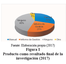 Como producto resultante del ejercicio investigativo por parte de los estudiantes y que fue entregado a los directivos de las entidades, como se muestra en la Figura I, se destacan los manuales de procesos y procedimientos y el informe de gestión, con el 30% y 25% respectivamente. Sin embargo, el 40% de los estudiantes no dejaron evidencia alguna a la entidad en la cual adelantaron los proyectos; porcentaje que es preocupante y que influye de manera significativa en la incidencia de la investigación contable formativa.