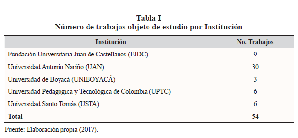 Una vez unificada la base de datos, se identificaron 235 proyectos, de dichos trabajos se hizo una pre-selección de aquellos que fueron aplicados en empresas del sector público y privado de la ciudad de Tunja, y que a su vez trataban los ejes temáticos principales de la profesión contable, como son: la auditoría, la contabilidad financiera, los costos, tributaria y adopción o adaptación a Normas Internacionales de Información Financiera (NIIF), constituyéndose 54 de ellos como muestra inicial u objeto del estudio, como se observa en la Tabla I.