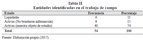 Durante la recolección de la información, no se pudo acceder a la totalidad de las empresas donde fueron aplicados los trabajos de grado que inicialmente conformaban la muestra (54), debido a que durante el trabajo de campo, se evidenció que el 11% de ellas habían sido liquidadas y el 15% no brindaron información al respecto, porque no tenían conocimiento de que se hubiese realizado algún proyecto por parte de los estudiantes de contaduría pública al interior de la organización; en virtud a ello, la muestra final la conformaron únicamente 40 entidades que brindaron información respecto a las variables objeto de estudio; síntesis que se presentan en la Tabla II.