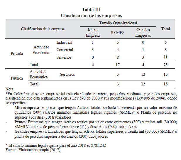Para la discusión y análisis de resultados, se presenta la clasificación de las empresas de acuerdo a su procedencia de capital, actividad económica y tamaño organizacional, como se puede apreciar en la Tabla III.