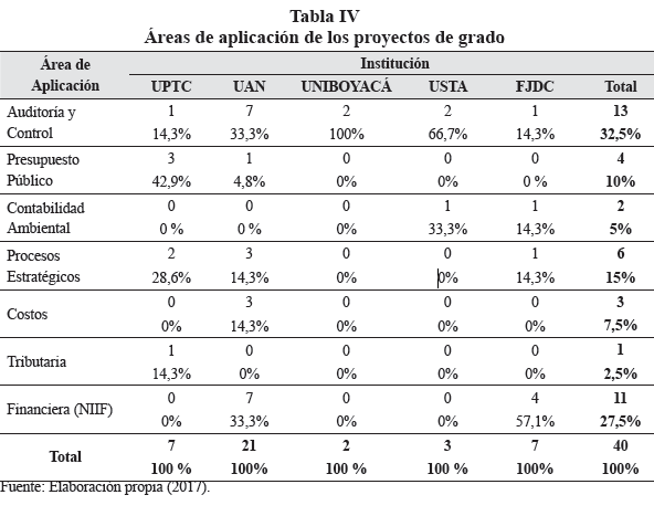 En la Tabla IV, se observa que el 32,5% de los trabajos se centran en problemáticas afines a la auditoria y el control interno, el 27,5% se aplican en el área financiera, el 15% en procesos estratégicos, el 10% en presupuesto público; entre las temáticas de menor interés se encuentran la contabilidad ambiental con el 5% y tributaria con un 2,5%. De igual forma, se aprecia que las temáticas estudiadas se relacionan con el eje de profundización y los perfiles profesionales de los programas académicos en cada una de las instituciones de educación superior.