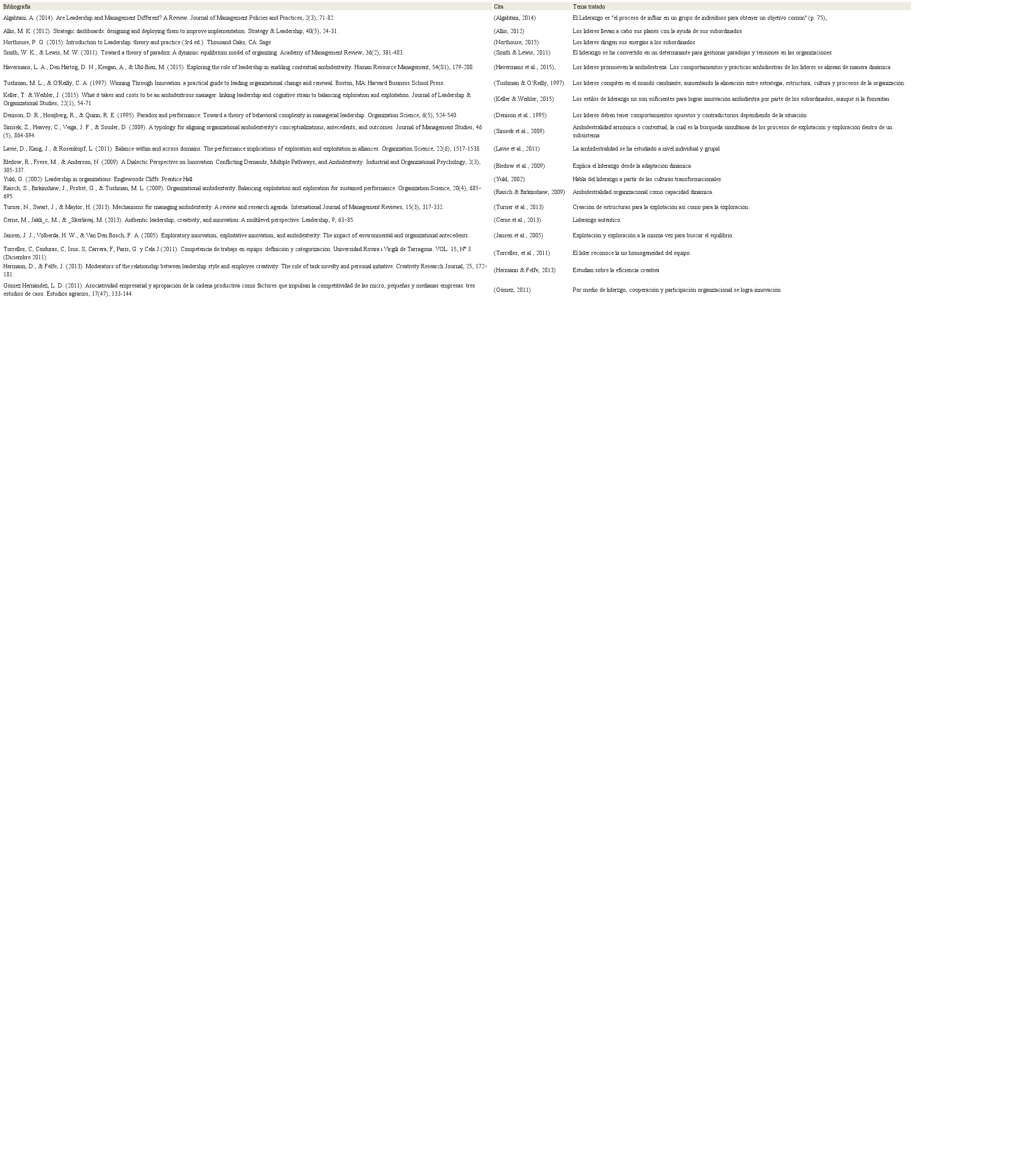 Ahlers, Martina y Wilms, Maximilian (2017). Ambidextrous leadership in innovation: A multiple case study of Innovation leader son the alignment of opening and closing leader behaviors. Master’s tesis. Linköping University Department of Management and Engineering (IEI). Pp. 109.