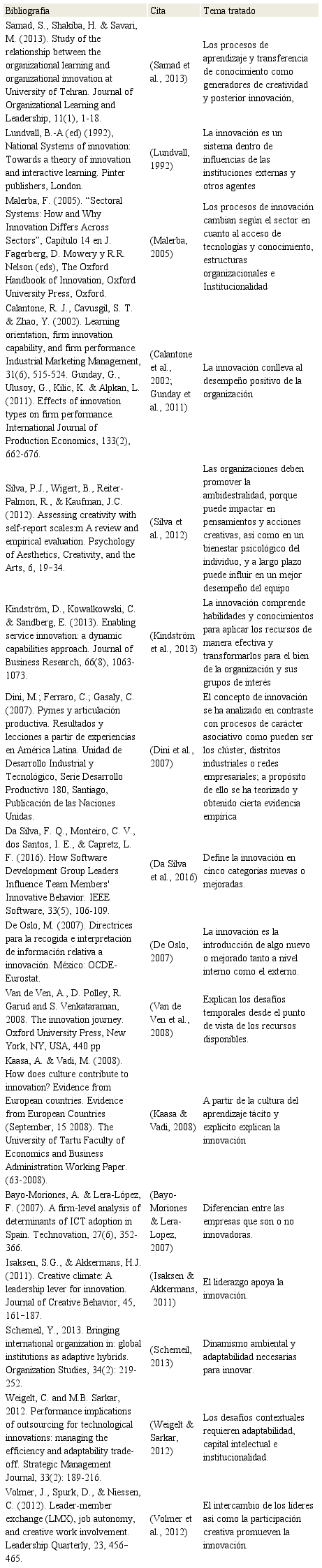 Hay aspectos importantes que se han analizado como apoyo al liderazgo para llegar a una productividad innovadora, la participación creativa de los empleados y el intercambio con calidad de los líderes, el liderazgo auténtico, las calificaciones que los líderes les otorgan a la creatividad de sus empleados, la autoeficacia creativa, la novedad de la tarea e iniciativa personal, el empoderamiento psicológico que se realiza con los empleados, la identidad creativa, entre otros (Yoshida et al., 2014). Entender la forma como innovan las empresas en su cotidianeidad, puede ayudar en la creación de políticas llamativas de incentivos para los empleados (Cabaleiro et al., 2016). En el Cuadro IV se muestran otros estudios que amplían el desarrollo del subtema Innovación.