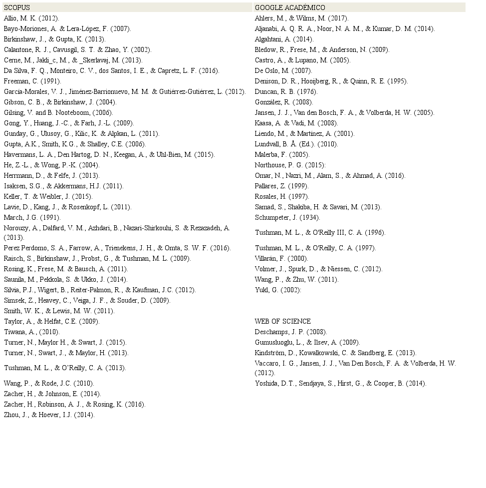 Vaccaro, Ignacio; Jansen, Justin; Van Den Bosch, Frans y Volberda, Henk (2012). “Management innovation and leadership: The moderating role of organizational size”. Journal of Management Studies. Vol. 49, No. 1. United Kingdom. Pp. 28-51.