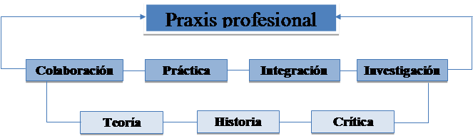 Asimismo, el trabajo colaborativo en el campo de la praxis profesional, en términos de problema o proyecto, es un elemento metodológico trascendente, práctico e integrador. Tal elemento, de acuerdo con los resultados de la investigación, debe ser planificado, gestionado y evaluado con apego a la triangulación de la teoría, la historia y la crítica.