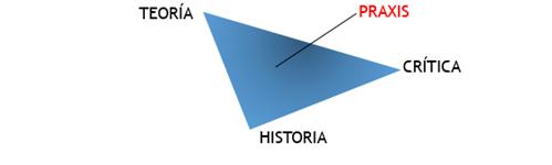 Asimismo, los sujetos (estudiantes y profesores), ubicados en el triángulo comprendido por la relación entre teoría, historia y crítica, donde la praxis es el baricentro; como se observa en la Figura II, establecen una dinámica generadora de nuevos objetos, casos y situaciones de estudio, así como de nuevas soluciones.