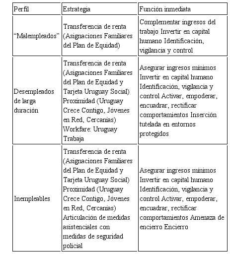 Los desempleados de larga duración y los inempleables configuran un perfil que “pone en duda la capacidad de los instrumentos tradicionales de fomento a la empleabilidad porque tienden a centrarse en franjas de población menos vulnerables y menos pobres” (Jara et al., 2013:11). Ambos grupos configuran el perfil de la denominada “población MIDES”3 y de acuerdo al discurso institucional, su problemática sería tan específica que demandaría otro repertorio de intervenciones, entre las que se cuentan las transferencias monetarias, las metodologías de proximidad y/o la vieja y siempre latente represión de las clases peligrosas.