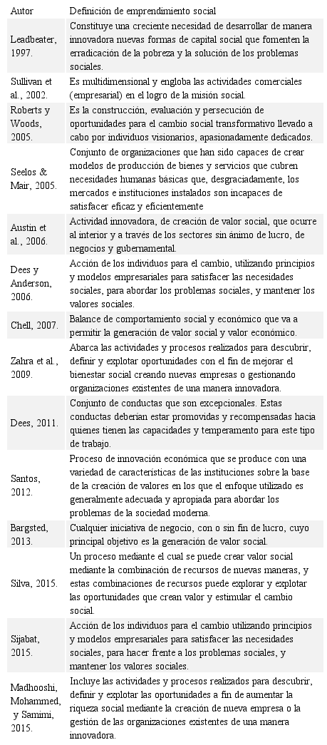 No existe una única e inequívoca definición del concepto de emprendimiento social, siendo ampliamente estudiado por la literatura científica, sobre todo a partir del inicio de los años noventa. En la Tabla 1 se muestran algunos de los principales autores y definiciones con las que se ha tratado de definir el emprendimiento social.