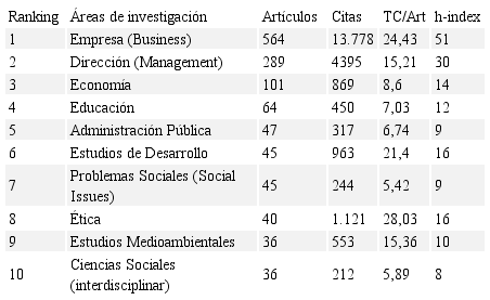 Como es previsible, la mayoría de artículos sobre emprendimiento social se encuadran en las áreas de conocimiento de empresa, economía o dirección de empresas, como se observa en la Tabla 2, si bien la transversalidad del tema lo vincula con otras materias como educación, ética, administración pública o medio ambiente.