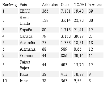 Los Estados Unidos lideran el ranking de los países más influyentes en cuanto a producción científica, de artículos (366) sobre emprendimiento social, como se muestra en la Tabla 3. Reino Unido ocupa el segundo lugar, con menos de la mitad de publicaciones (159), pero con un mayor promedio de citas.