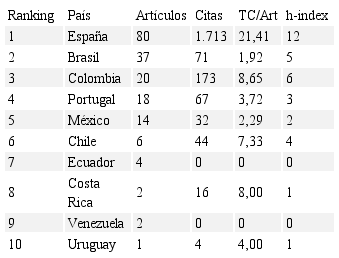En cuanto a la influencia de los países iberoamericanos (ver Tabla 4), los más prolíficos son España (80) y Brasil (37), que ocupan el tercer y undécimo puesto de la clasificación mundial respectivamente y tienen una posición dominante. Colombia, Portugal y México completan el elenco de países iberoamericanos que superan la decena de publicaciones. Estos cinco países copan el 91% de las publicaciones (ver Figura IV) y el 97% de las citas.