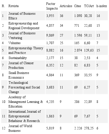 Analizando las revistas con impacto JCR en la Tabla 5, se encuentra que las dos revistas con mayor número de manuscritos son Journal of Business Ethics (36) y Entrepreneuship and Regional Development (34), que aglutinan entre las dos un 5,6% del total de artículos publicados, destacan también por su elevado h-index, lo que indica que los escritos de estas revistas han estudiado la materia en profundidad.