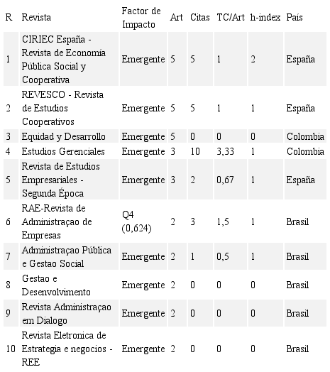 Las revistas iberoamericanas no han sido especialmente prolíficas en cuanto a investigaciones publicadas sobre emprendimiento social, tal como se muestra en la Tabla 7, destacando las españolas CIRIEC España - Revista de Economía Pública Social y Cooperativa y REVESCO - Revista de Estudios Cooperativos y las colombianas Equidad y Desarrollo, y Estudios Gerenciales. Esta última es la que presenta un mayor número de citas. La brasileña Revista de Administraçao de Empresas es la única revista iberoamericana con factor de impacto en JCR (Q4) incluida entre las 10 primeras.