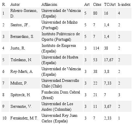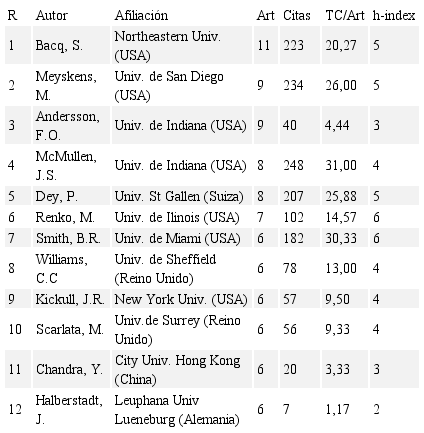 Ningún autor iberoamericano entra en posiciones destacadas de producción científica, aunque quedan cerca, tal y como se puede observar en la Tabla 9. Sin embargo, en cuanto a número de referencias, el profesor Domingo Ribeiro-Soriano de la Universidad de Valencia (España) y la profesora Rachida Justo, del Instituto de Empresa (España), alcanzan posiciones destacadas de influencia en términos de citas recibidas.