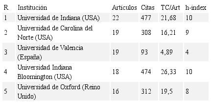 Como es previsible, las instituciones más productivas en estudios relativos a emprendimiento social, como se muestra en la Tabla 10, son Universidades de Estados Unidos, posicionándose en primer lugar la Universidad de Indiana, con 22 artículos y 477 referencias. Entre las cinco primeras se encuentra la Universidad de Valencia, donde el Centro Internacional de Investigación e Información sobre la Economía Pública, Social y Cooperativa (CIRIEC) tiene su sede en España.