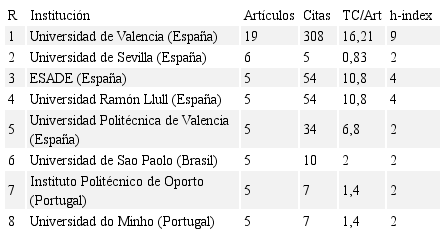 Existe una considerable diferencia en el número de artículos de la institución iberoamericana líder en producción científica, la Universidad de Valencia (España) y las siguientes entidades, tal como se observa en la Tabla 11. Asimismo, se puede hacer una correspondencia entre instituciones y autores en el caso del Instituto Politécnico de Oporto (Portugal) y la Universidad do Minho (Portugal), al coincidir el número de citas.