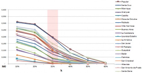 Así, para decidir sobre k, se estimó el valor de M0 en las comunas y corregimientos de Medellín para diferentes valores del umbral de pobreza k, este ejercicio permitió constatar, como se observa en la Figura I, que la relación del nivel de pobreza se mantiene a pesar del cambio en el valor del parámetro (Santos, et al., 2015); el ranking de comunas y corregimientos es consistente ante cambios en versiones alternativas del umbral de pobreza multidimensional.