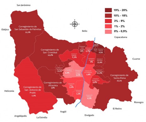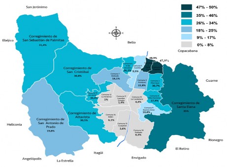 La distribución espacial de los resultados del porcentaje de población pobre y su profundidad, muestran diferencias que evidencian segregación socioespacial. Por ejemplo, el porcentaje de población pobre multidimensionalmente en la comuna 1 (Popular) ubicada en la zona nororiental de la ciudad es de 48%, mientras que en la comuna 14 (El Poblado) ubicada en la zona sur de la ciudad, es de 0,3%. En cuanto a la profundidad de la pobreza, se observa que la distribución es más homogénea, es decir, tienen menos variabilidad y, por tanto, los pobres multidimensionales estarán privados, en la mayoría de las comunas, entre un 35% y 45% de los indicadores medidos.